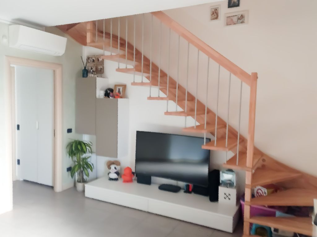 al Piano terra con piccolo giardino privato dove è stata posizionata erba sintetica, proseguendo sempre nella proprietà collegamento diretto con la zona giorno posta al piano primo, al termine della scala privata ampia terrazza in parte coperta ed in parte con tenda motorizzata, ingresso dalla zona giorno dove nella prima parte trovano spazio dal un lato la zona Tv e dall'altro ampia zona divano, la cucina separata dalla zona giorno permette di avare da un lato la zona pranzo di buone dimensione e dagli altri due lati la zona cucina ad "L".