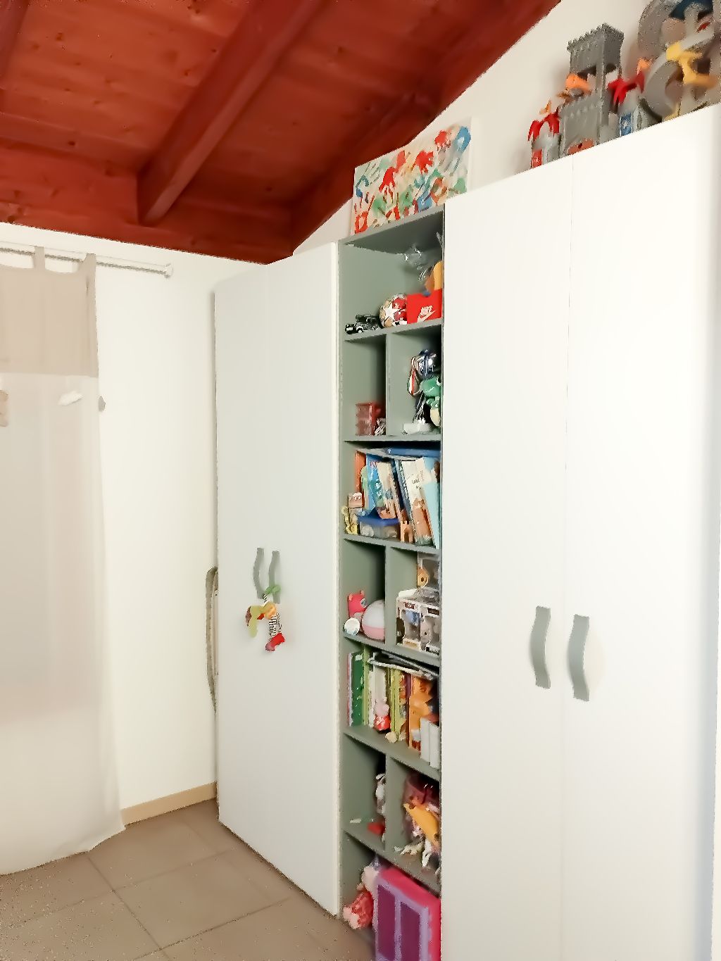 A terminare la zona giorno piccolo disimpegno con mobile su misura per dispensa / appendi abiti / scarpiera con funzionale bagno di servizio