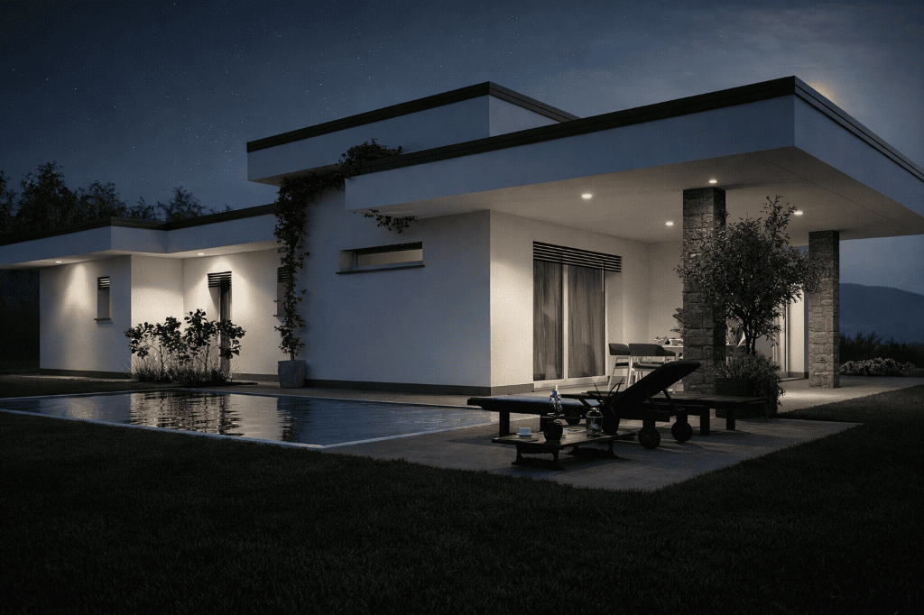 Progettata con estrema cura ed attenzione fin nei minimi particolari, la prestigiosa residenza sfoggia un design elegante e raffinato, frutto di uno studio in perfetto stile moderno. Con una superficie abitabile complessiva di quasi 200 mq, la dimora si sviluppa su unico livello e ospita tre moderne ed eleganti camere da letto, la padronale con bagno “en suit” , bagno di servizio, un grande portico.